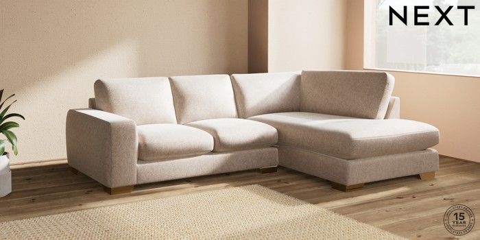 7.2.10 Houghton Deep Sit Medium Corner Chaise - Right Hand Cotswold Chenille Light Natural Large Square Angle - Brushed Brass | Made Click here to use our website with more accessibility support, for example screen readers