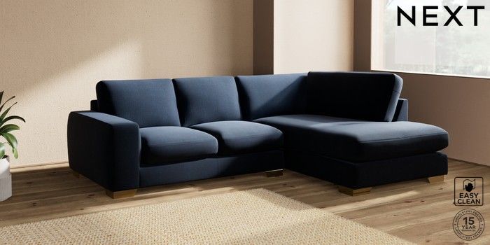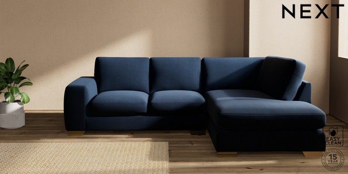 7.2.10 Houghton Deep Sit Medium Corner Chaise - Right Hand Fine Chenille Easy Clean Dark Navy Blue Large Square Angle - Brushed Brass | Made Click here to use our website with more accessibility support, for example screen readers