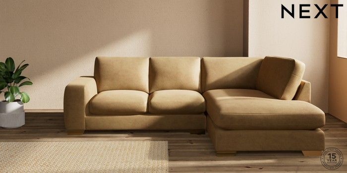 7.2.10 Houghton Deep Sit Medium Corner Chaise - Right Hand Luxe Chenille Honey Yellow Large Square Angle - Brushed Brass | Made Click here to use our website with more accessibility support, for example screen readers