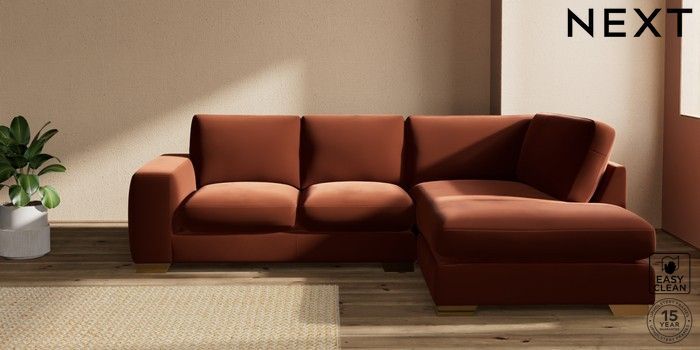 7.2.10 Houghton Deep Sit Medium Corner Chaise - Right Hand Plush Velvet Easy Clean Ginger Orange Large Square Angle - Brushed Brass | Made Click here to use our website with more accessibility support, for example screen readers