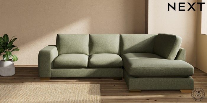 7.2.10 Houghton Deep Sit Medium Corner Chaise - Right Hand Tweedy Chenille Mid Moss Green Large Square Angle - Brushed Brass | Made Click here to use our website with more accessibility support, for example screen readers
