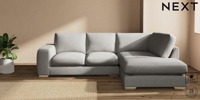 7.2.10 Houghton Deep Sit Medium Corner Chaise - Right Hand Woven Chenille Easy Clean Light Grey Large Square Angle - Chrome Metal | Made Click here to use our website with more accessibility support, for example screen readers