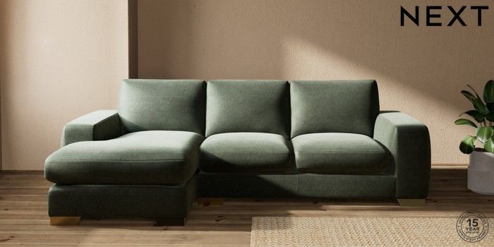 7.2.10 Houghton Deep Sit Medium Sofa Chaise - Left Hand Luxe Chenille Mid Green Large Square Angle - Brushed Brass | Made Click here to use our website with more accessibility support, for example screen readers