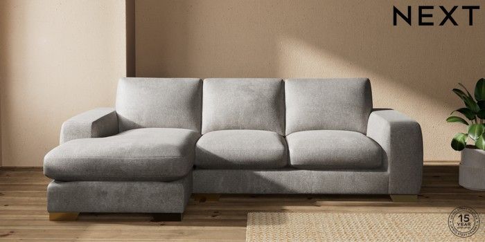 7.2.10 Houghton Deep Sit Medium Sofa Chaise - Left Hand Plush Chenille Light Grey Large Square Angle - Brushed Brass | Made Click here to use our website with more accessibility support, for example screen readers