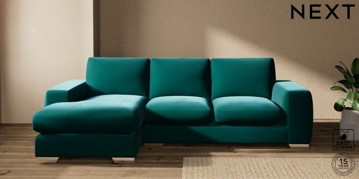 7.2.10 Houghton Deep Sit Medium Sofa Chaise - Left Hand Plush Velvet Easy Clean Juniper Green Large Square Angle - Chrome Metal | Made Click here to use our website with more accessibility support, for example screen readers