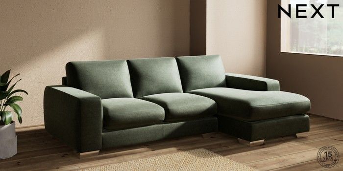 7.2.10 Houghton Deep Sit Medium Sofa Chaise - Right Hand Luxe Chenille Mid Green Large Square Angle - Chrome Metal | Made Click here to use our website with more accessibility support, for example screen readers