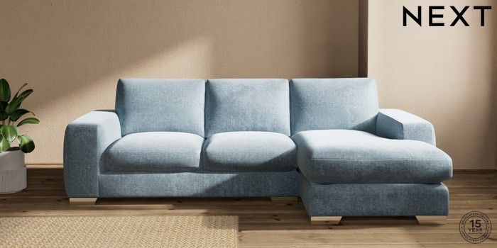 7.2.10 Houghton Deep Sit Medium Sofa Chaise - Right Hand Plush Chenille Light Blue Large Square Angle - Chrome Metal | Made Click here to use our website with more accessibility support, for example screen readers