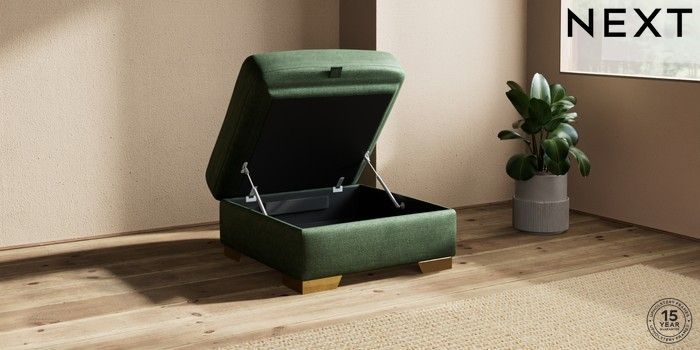 7.2.10 Houghton Deep Sit Storage Footstool Luxe Chenille Dark Green Square Angle - Brushed Brass | Made Click here to use our website with more accessibility support, for example screen readers