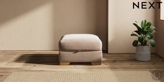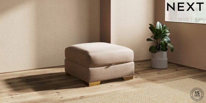 7.2.10 Houghton Deep Sit Storage Footstool Luxe Chenille Mid Natural Square Angle - Brushed Brass | Made Click here to use our website with more accessibility support, for example screen readers