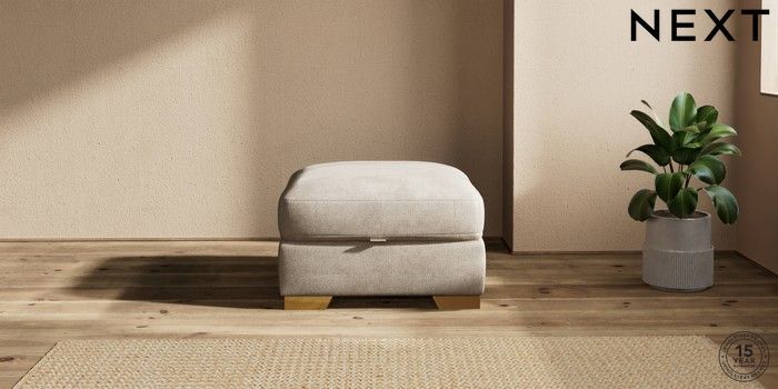 7.2.10 Houghton Deep Sit Storage Footstool Plush Chenille Light Natural Square Angle - Brushed Brass | Made Click here to use our website with more accessibility support, for example screen readers
