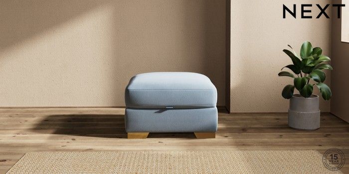 7.2.10 Houghton Deep Sit Storage Footstool Relaxed Linen Look Mid Blue Square Angle - Brushed Brass | Made Click here to use our website with more accessibility support, for example screen readers
