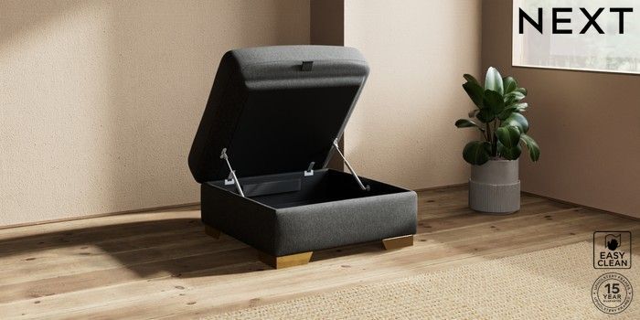 7.2.10 Houghton Deep Sit Storage Footstool Tweedy Blend Easy Clean Charcoal Grey Square Angle - Brushed Brass | Made Click here to use our website with more accessibility support, for example screen readers