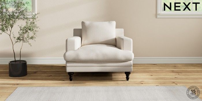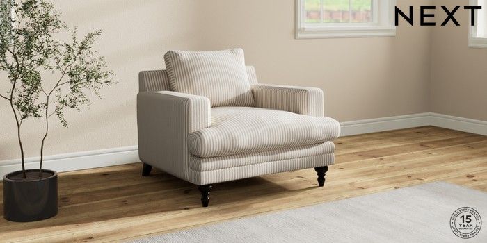 7.2.10 Hutton Deep Relaxed Sit Armchair Chenille Stripe Natural Country Turned - Dark | Made Click here to use our website with more accessibility support, for example screen readers