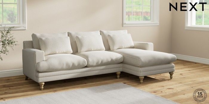 7.2.10 Hutton Deep Relaxed Sit Medium Sofa Chaise - Right Hand Chenille Stripe Moss Green Country Turned - Light | Made Click here to use our website with more accessibility support, for example screen readers