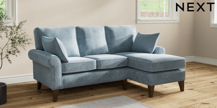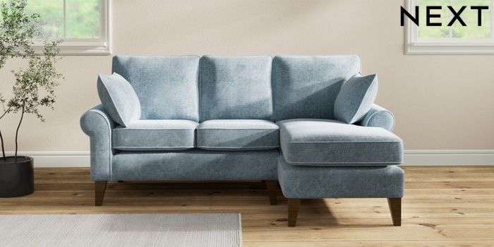7.2.10 Mallory Small Sofa Chaise - Right Hand Plush Chenille Light Blue High Tapered - Mid | Made Click here to use our website with more accessibility support, for example screen readers