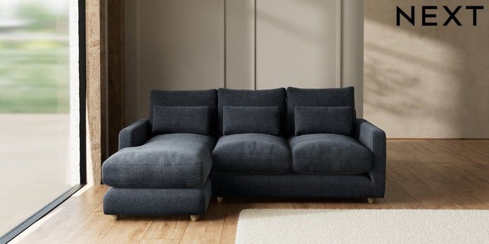 7.2.10 N Premium Farndon Grand Relaxed Sit Medium Sofa Chaise - Left Hand Boucle Chenille Dark Slate Blue Wooden Glide - Light | Made Click here to use our website with more accessibility support, for example screen readers
