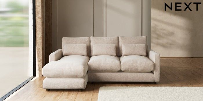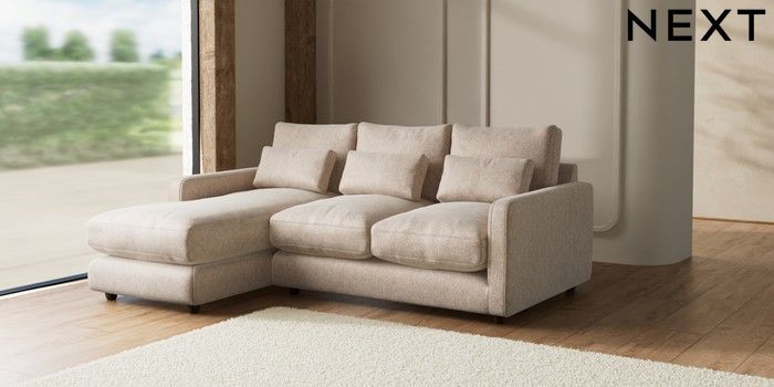 7.2.10 N Premium Farndon Grand Relaxed Sit Medium Sofa Chaise - Left Hand Cotswold Chenille Light Natural Wooden Glide - Mid | Made Click here to use our website with more accessibility support, for example screen readers