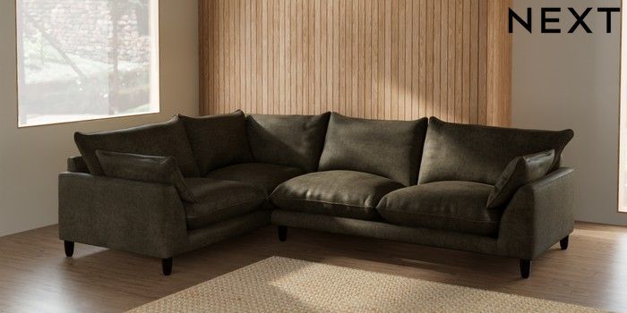 7.2.10 Noa Deep Relaxed Sit Large Corner Sofa - Left Hand Plush Chenille Moss Green High Leg - Dark | Made Click here to use our website with more accessibility support, for example screen readers