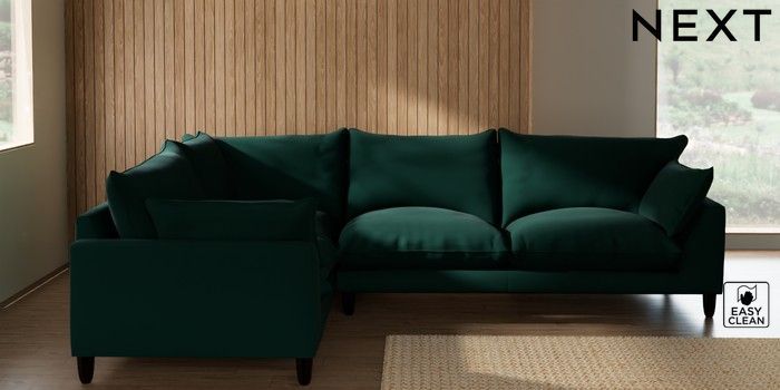 7.2.10 Noa Deep Relaxed Sit Large Corner Sofa - Left Hand Plush Velvet Easy Clean Bottle Green High Leg - Dark | Made Click here to use our website with more accessibility support, for example screen readers