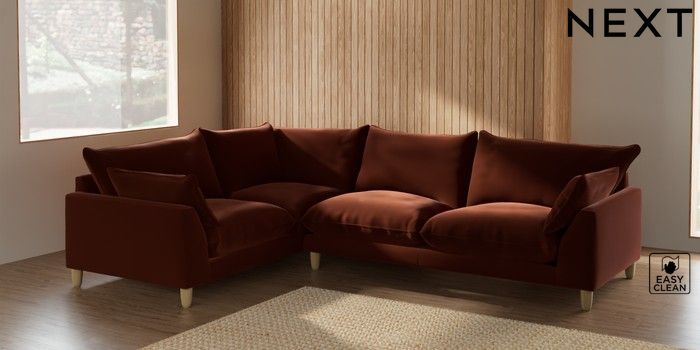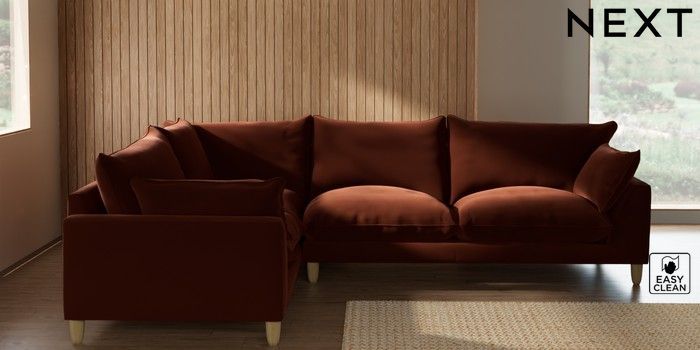 7.2.10 Noa Deep Relaxed Sit Large Corner Sofa - Left Hand Plush Velvet Easy Clean Ginger Orange High Leg - Light | Made Click here to use our website with more accessibility support, for example screen readers