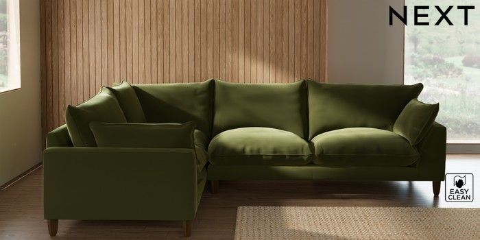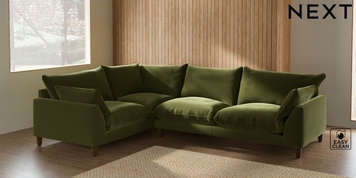7.2.10 Noa Deep Relaxed Sit Large Corner Sofa - Left Hand Plush Velvet Easy Clean Mid Olive Green High Leg - Mid | Made Click here to use our website with more accessibility support, for example screen readers