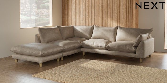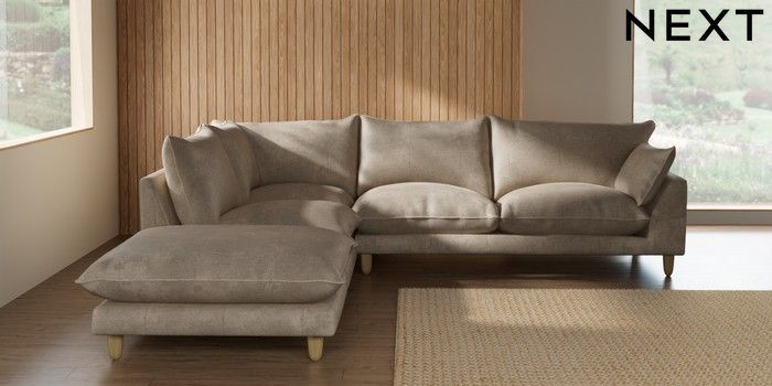 7.2.10 Noa Deep Relaxed Sit Large Open End Corner Chaise - Left Hand Plush Chenille Light Natural High Leg - Light | Made Click here to use our website with more accessibility support, for example screen readers
