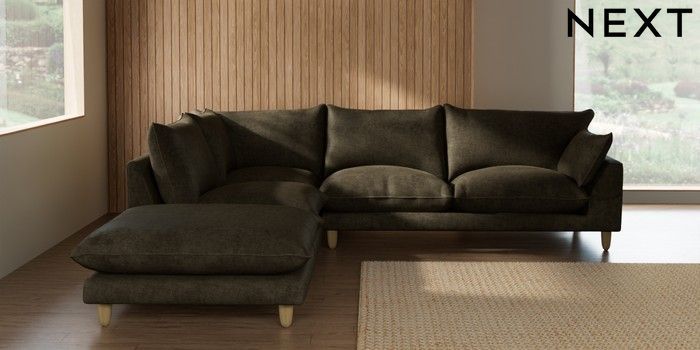 7.2.10 Noa Deep Relaxed Sit Large Open End Corner Chaise - Left Hand Plush Chenille Moss Green High Leg - Light | Made Click here to use our website with more accessibility support, for example screen readers