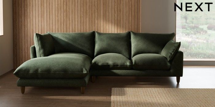 7.2.10 Noa Deep Relaxed Sit Medium Corner Chaise - Left Hand Boucle Chenille Dark Moss Green High Leg - Light | Made Click here to use our website with more accessibility support, for example screen readers