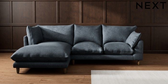 7.2.10 Noa Deep Relaxed Sit Medium Corner Chaise - Left Hand Plush Chenille Slate Blue High Leg - Dark | Made Click here to use our website with more accessibility support, for example screen readers