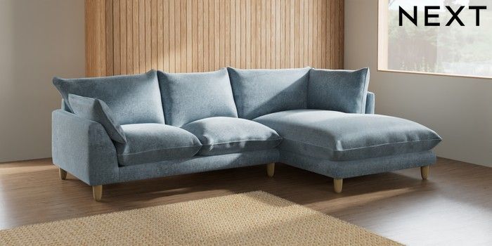 7.2.10 Noa Deep Relaxed Sit Medium Corner Chaise - Right Hand Plush Chenille Light Blue High Leg - Light | Made Click here to use our website with more accessibility support, for example screen readers