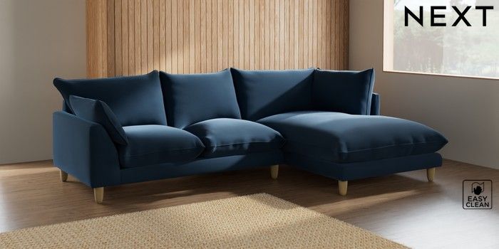 7.2.10 Noa Deep Relaxed Sit Medium Corner Chaise - Right Hand Plush Velvet Easy Clean Airforce Blue High Leg - Light | Made Click here to use our website with more accessibility support, for example screen readers