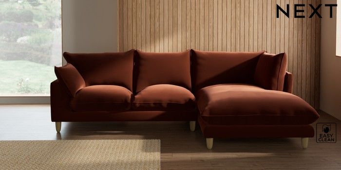 7.2.10 Noa Deep Relaxed Sit Medium Corner Chaise - Right Hand Plush Velvet Easy Clean Ginger Orange High Leg - Light | Made Click here to use our website with more accessibility support, for example screen readers