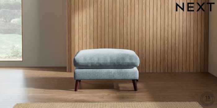 7.2.10 Orlo Relaxed Sit Footstool Plush Chenille Light Blue Retro Tapered - Dark Brown | Made Click here to use our website with more accessibility support, for example screen readers