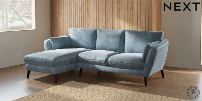 7.2.10 Orlo Relaxed Sit Medium Sofa Chaise - Left Hand Plush Chenille Light Blue Retro Tapered - Dark Brown | Made Click here to use our website with more accessibility support, for example screen readers