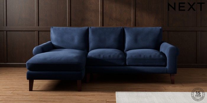 7.2.10 Palermo Relaxed Sit Medium Sofa Chaise - Left Hand Luxe Chenille Navy Blue Tapered - Dark Brown | Made Click here to use our website with more accessibility support, for example screen readers