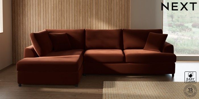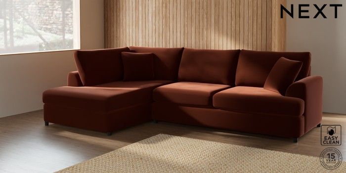 7.2.10 Parker Platform Large Corner Chaise - Left Hand Plush Velvet Easy Clean Ginger Orange Glide | Made Click here to use our website with more accessibility support, for example screen readers