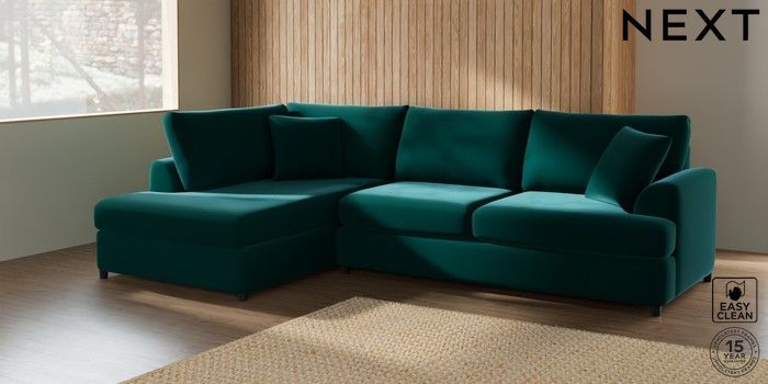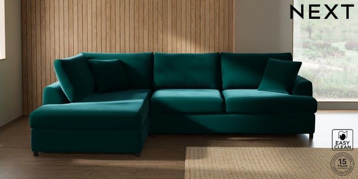 7.2.10 Parker Platform Large Corner Chaise - Left Hand Plush Velvet Easy Clean Juniper Green Glide | Made Click here to use our website with more accessibility support, for example screen readers