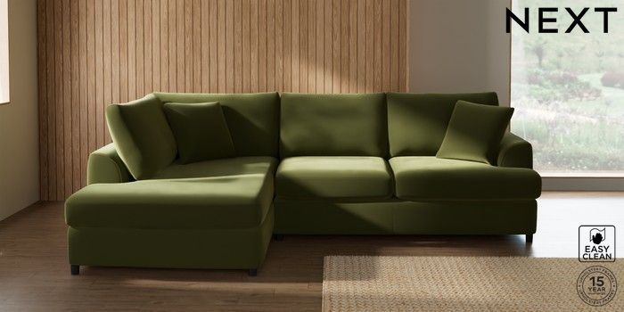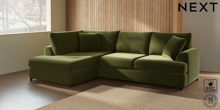7.2.10 Parker Platform Medium Corner Chaise - Left Hand Plush Velvet Easy Clean Mid Olive Green Glide | Made Click here to use our website with more accessibility support, for example screen readers