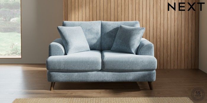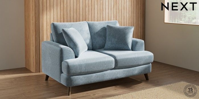 7.2.10 Parker 2 Seater Small Sofa Plush Chenille Light Blue Low Retro Tapered - Mid | Made Click here to use our website with more accessibility support, for example screen readers