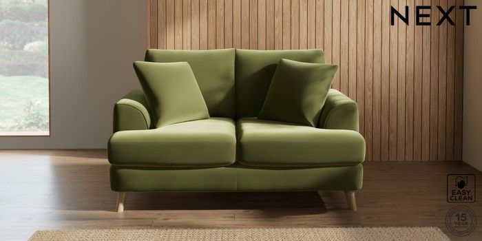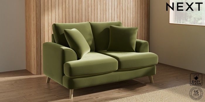 7.2.10 Parker 2 Seater Small Sofa Plush Velvet Easy Clean Mid Olive Green Low Retro Tapered - Light | Made Click here to use our website with more accessibility support, for example screen readers