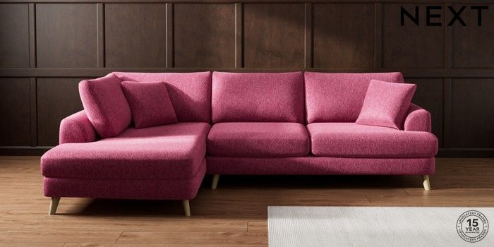 7.2.10 Parker Large Corner Chaise - Left Hand Cotswold Chenille Dark Raspberry Pink Low Retro Tapered - Light | Made Click here to use our website with more accessibility support, for example screen readers