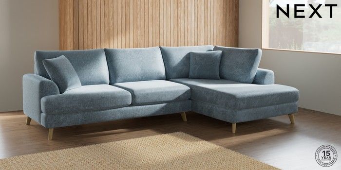 7.2.10 Parker Large Corner Chaise - Right Hand Plush Chenille Light Blue Low Retro Tapered - Light | Made Click here to use our website with more accessibility support, for example screen readers