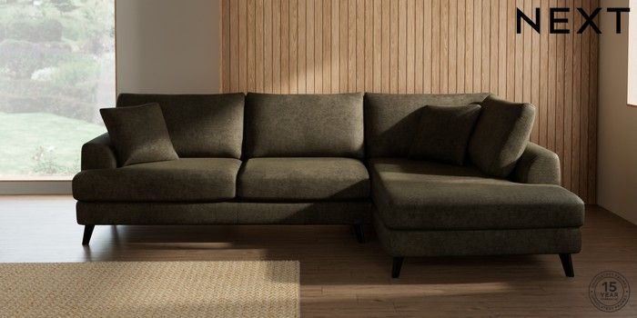7.2.10 Parker Large Corner Chaise - Right Hand Plush Chenille Moss Green Low Retro Tapered - Dark | Made Click here to use our website with more accessibility support, for example screen readers