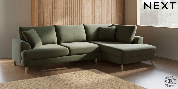 7.2.10 Parker Large Corner Chaise - Right Hand Ripple Chenille Mid Moss Green Low Retro Tapered - Light | Made Click here to use our website with more accessibility support, for example screen readers