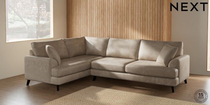 7.2.10 Parker Large Corner Sofa - Left Hand Plush Chenille Light Natural Low Retro Tapered - Dark | Made Click here to use our website with more accessibility support, for example screen readers