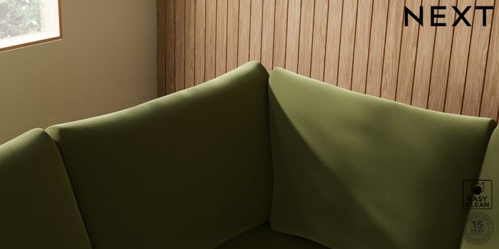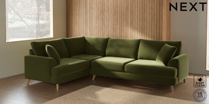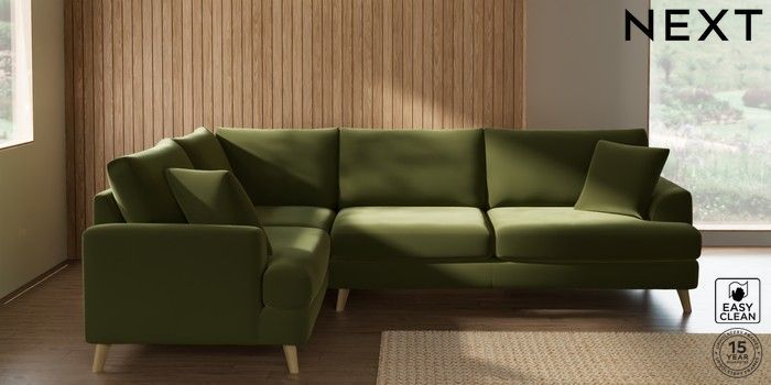 7.2.10 Parker Large Corner Sofa - Left Hand Plush Velvet Easy Clean Mid Olive Green Low Retro Tapered - Light | Made Click here to use our website with more accessibility support, for example screen readers