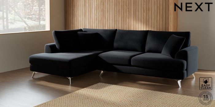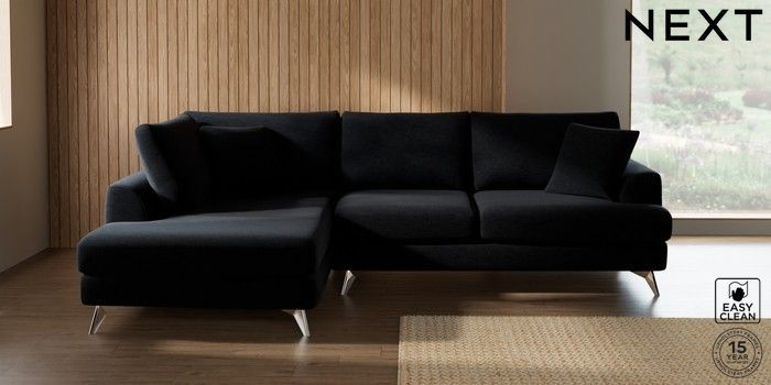 7.2.10 Parker Medium Corner Chaise - Left Hand Fine Chenille Easy Clean Black High Metal - Chrome | Made Click here to use our website with more accessibility support, for example screen readers