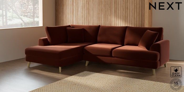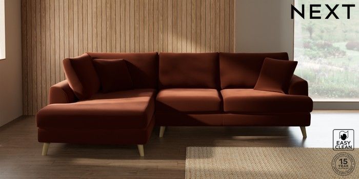 7.2.10 Parker Medium Corner Chaise - Left Hand Plush Velvet Easy Clean Ginger Orange Low Retro Tapered - Light | Made Click here to use our website with more accessibility support, for example screen readers