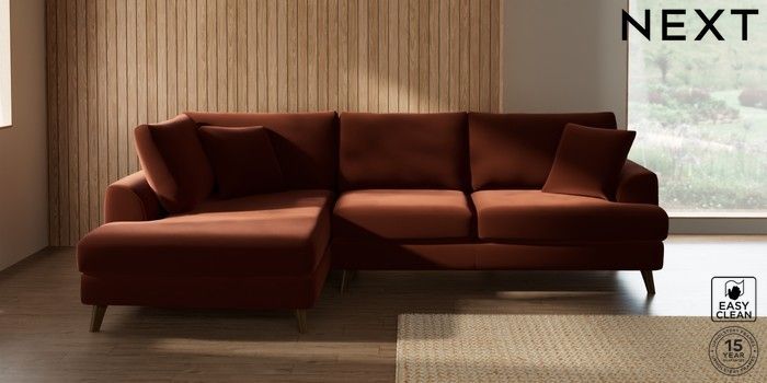 7.2.10 Parker Medium Corner Chaise - Left Hand Plush Velvet Easy Clean Ginger Orange Low Retro Tapered - Mid | Made Click here to use our website with more accessibility support, for example screen readers