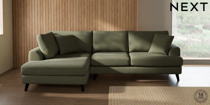 7.2.10 Parker Medium Corner Chaise - Left Hand Tweedy Chenille Mid Moss Green Low Retro Tapered - Dark | Made Click here to use our website with more accessibility support, for example screen readers